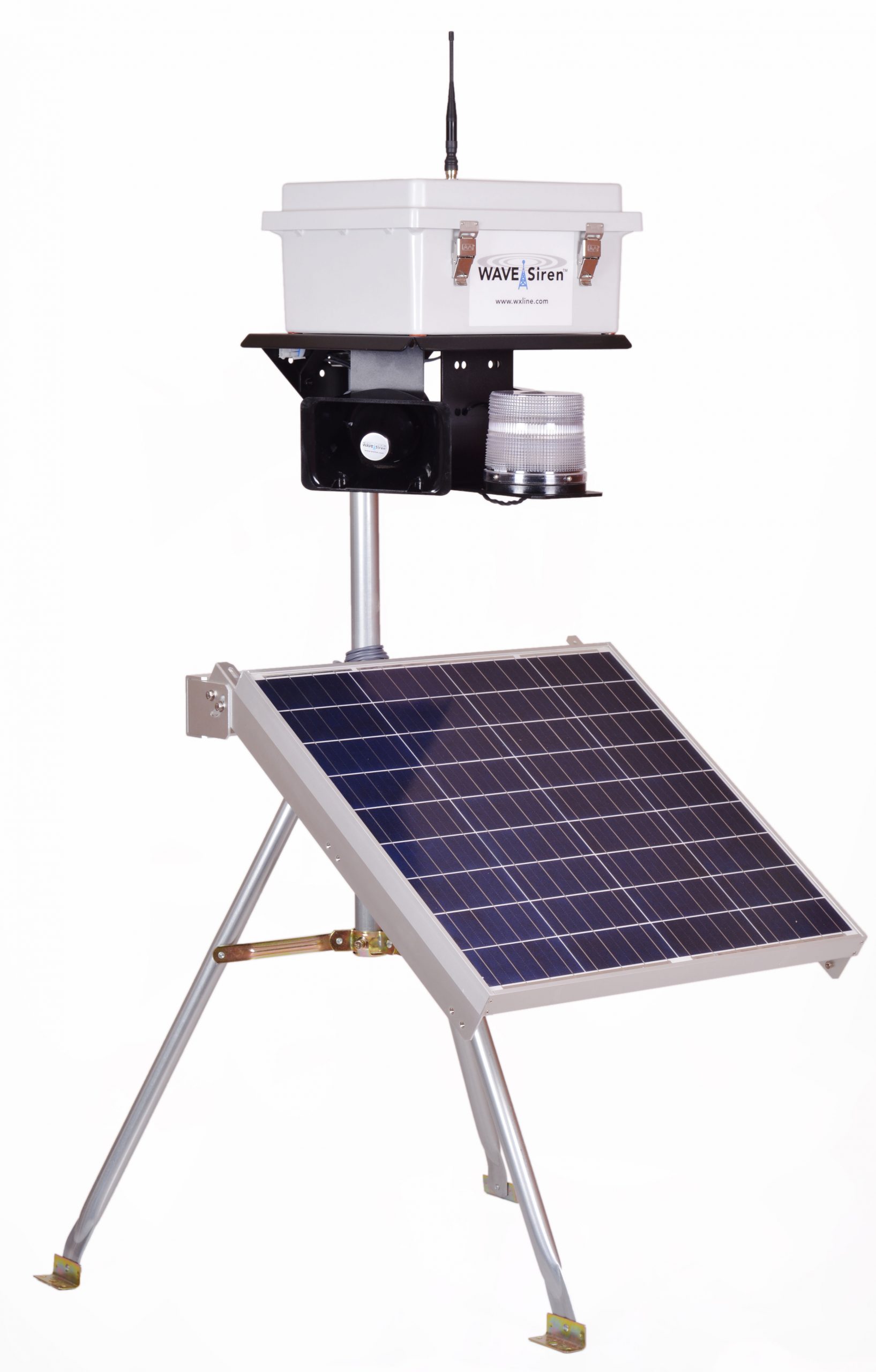 Multi-function, Single remote siren station with one all-weather 120-degree directional horn, one high-intensity strobe, radio receiver, 55 WATT Solar panel with upgraded battery back-up, mounting plate, and antenna.